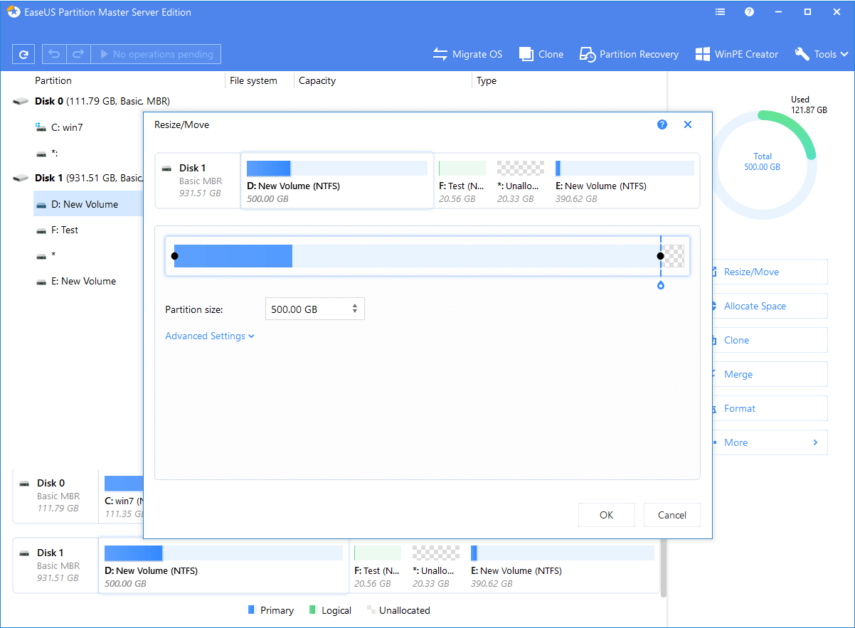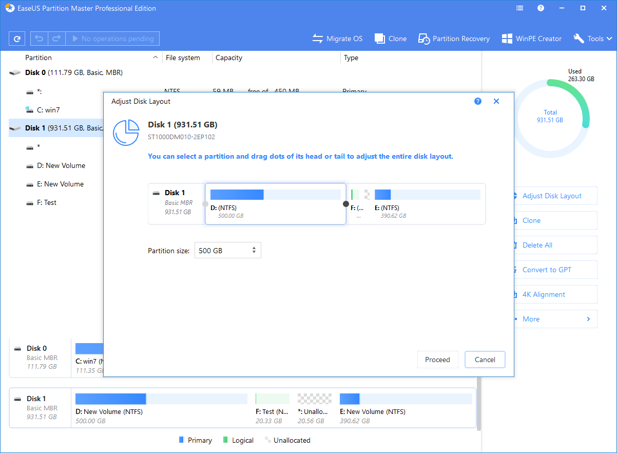 Anda boleh menyesuaikan saiz partisi secara fleksibel dengan menolak partisi ke kiri dan kanan atau memasukkan saiz partisi yang anda mahukan. Tiada risiko kehilangan data.